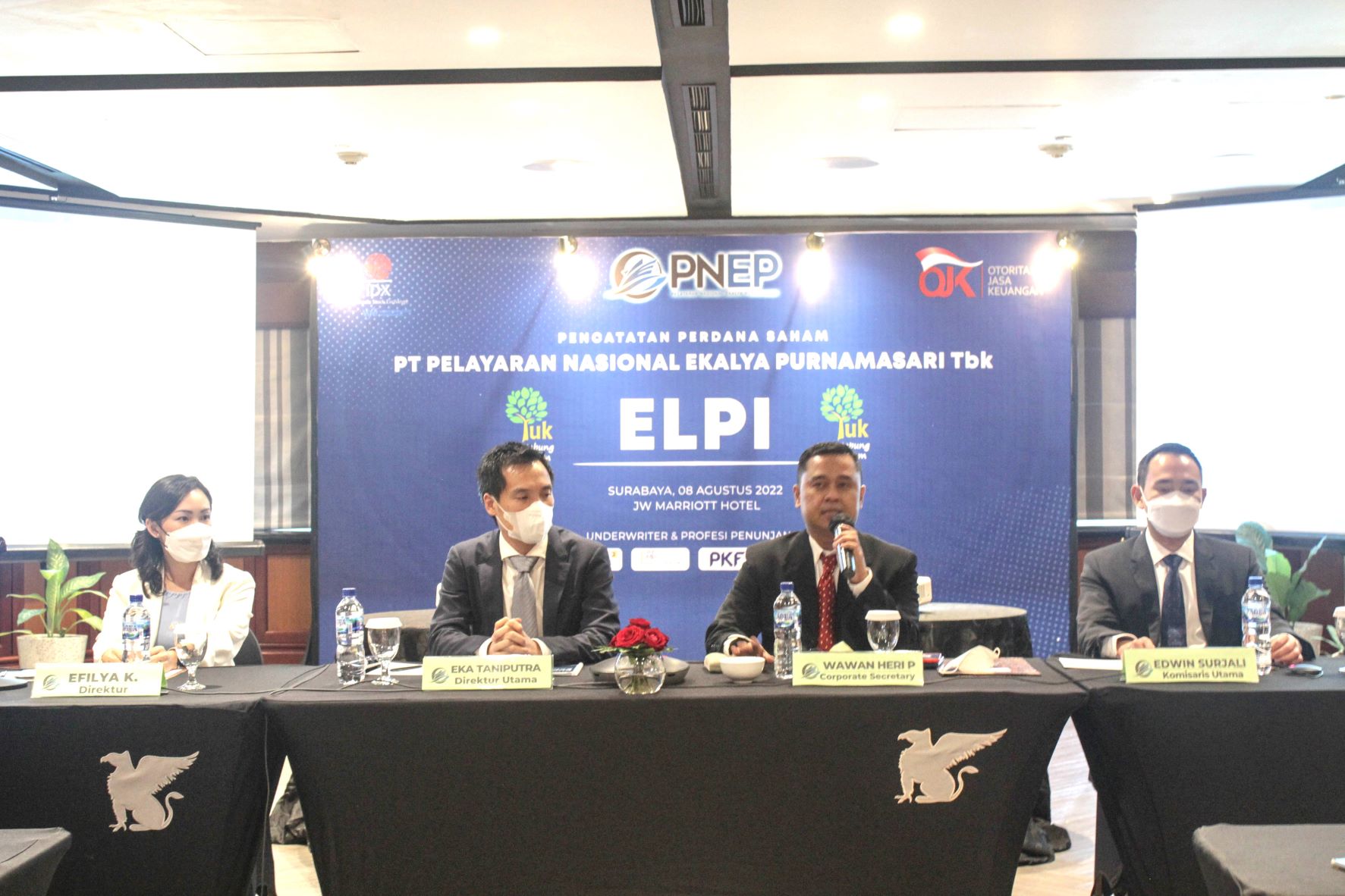 Perusahaan yang bergerak di bidang angkutan laut dan aktivitas penunjang angkutan, PT Pelayaran Nasional Ekalya Purnamasari Tbk (ELPI) secara resmi mencatatkan sahamnya di Bursa Efek Indonesia pada hari ini, tanggal 8 Agustus 2022 dengan harga penawaran yaitu Rp200. Melalui pencatatan perdana saham ini, Perseroan berharap dapat mengembangkan bisnis dengan memperluas ekspansi armada dan layanan yang disediakan oleh Perseroan. https://www.lantaibursa.id/2022/08/sukses-melantai-di-bursa-elpi-bakal-raup-dana-segar-rp2224-miliar/